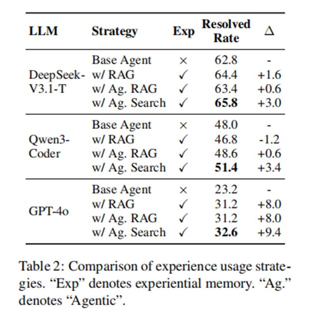随着经验卡片数量从10%增加到100%,智能体的修复率呈现单调上升趋势,证明了大规模经验记忆的有效性。