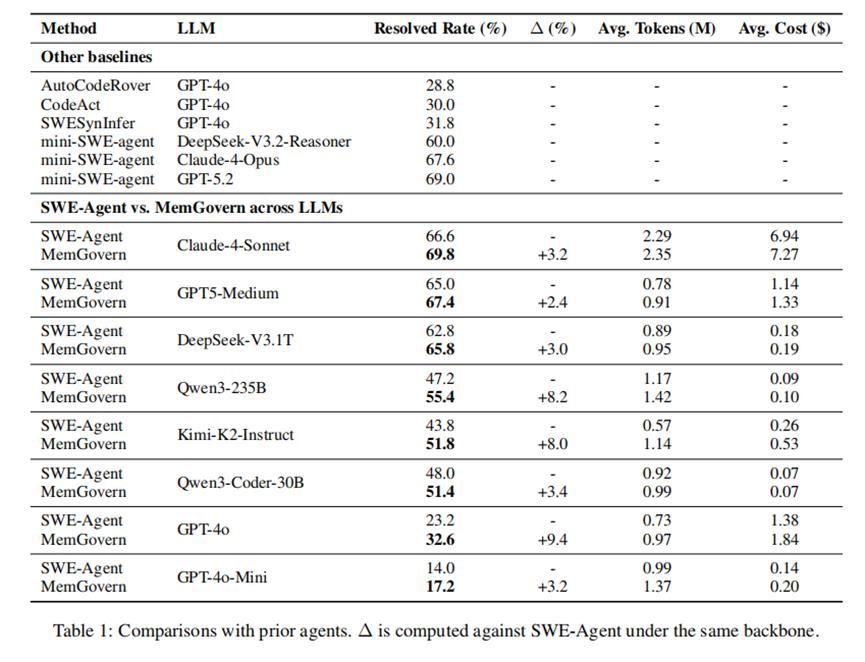 研究团队在SWE-bench Verified上进行了详尽的评测。结果显示,MemGovern在所有测试模型上都取得了显著提升。
