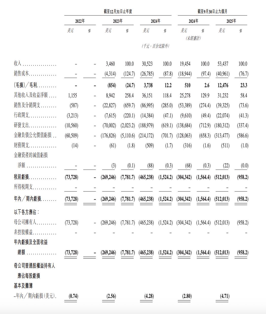 MiniMax的研发开支同样迅速放大,2023年为5436万美元,2024年为1.85亿美元,2025年前九个月为2.21亿美元。最直观的对比是,MiniMax 2024年的研发投入约为当年收入的六倍。