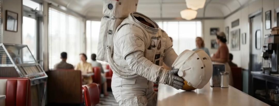 △ 用AI生“宇航员坐在咖啡厅前”图,普通AI(上)与HCS(下)效果对比,后者更具备真实光线质感与景深