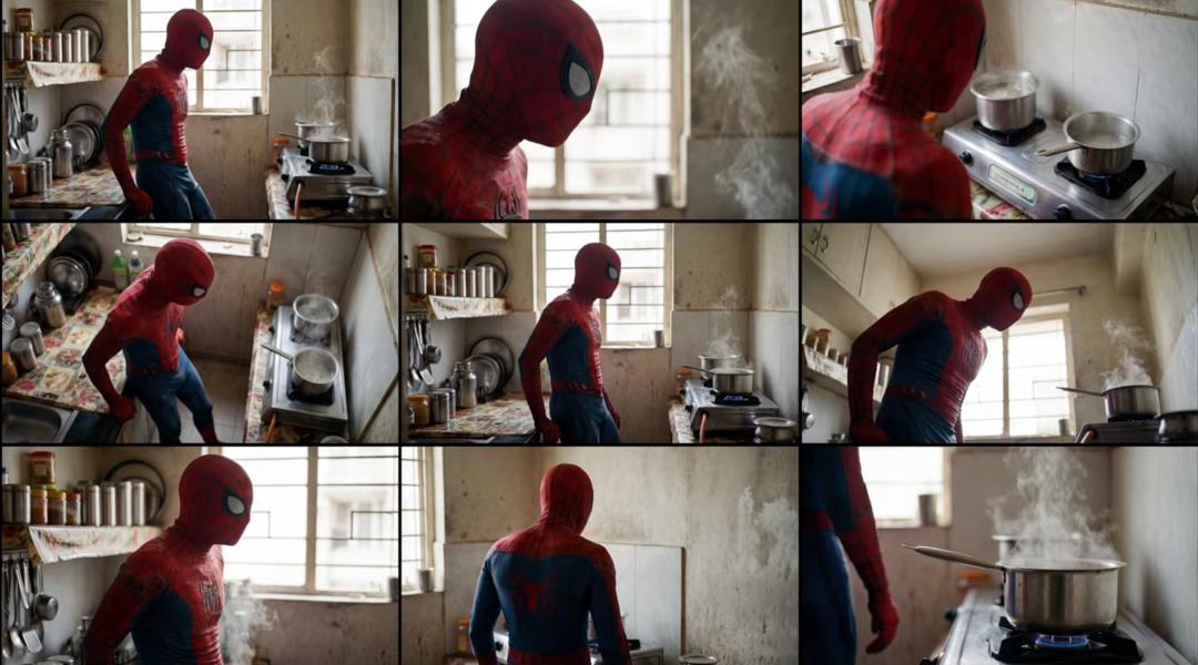△ 用户生成“蜘蛛侠在印度家庭厨房”的连续关键帧