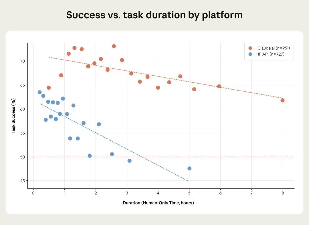 但在 Anthropic 的实际用户数据中,这个时间界限被显著拉长了。