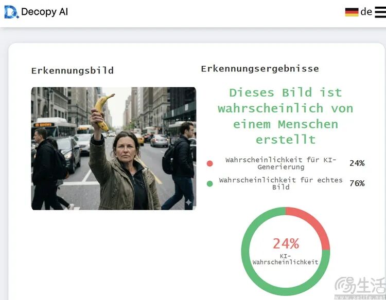 这个修改产生了一点作用,之前能“认出”这是AI生成图片的其中一个平台,现在就报告图片是“非AI生成的”了,但超过半数的检测工具依然可以正确判断这是一张“AI图片”。换句话说,虽然现如今很多AI生成图片工具(特别是那些带有AI图像编辑功能的手机)都会出于“讨好用户”的目的,允许关闭可见的图像水印。但这种“给人看”的水印,反倒并不太影响AI检测工具的判断。
