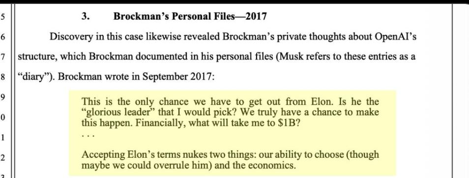 最具爆炸性的证据来自Greg Brockman 2017年9月至11月的私人日记,这些内容通过法律发现程序被强制公开,现在成了马斯克手里最锋利的刀。