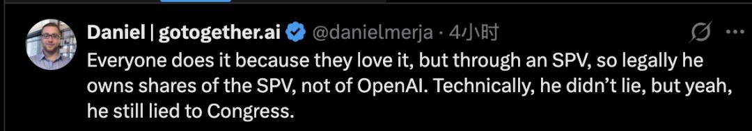 有投资者指出,严格地说奥特曼持有的股份通过SPV(特殊目的载体)实现,从法律意义上讲确实不算OpenAI的股份。