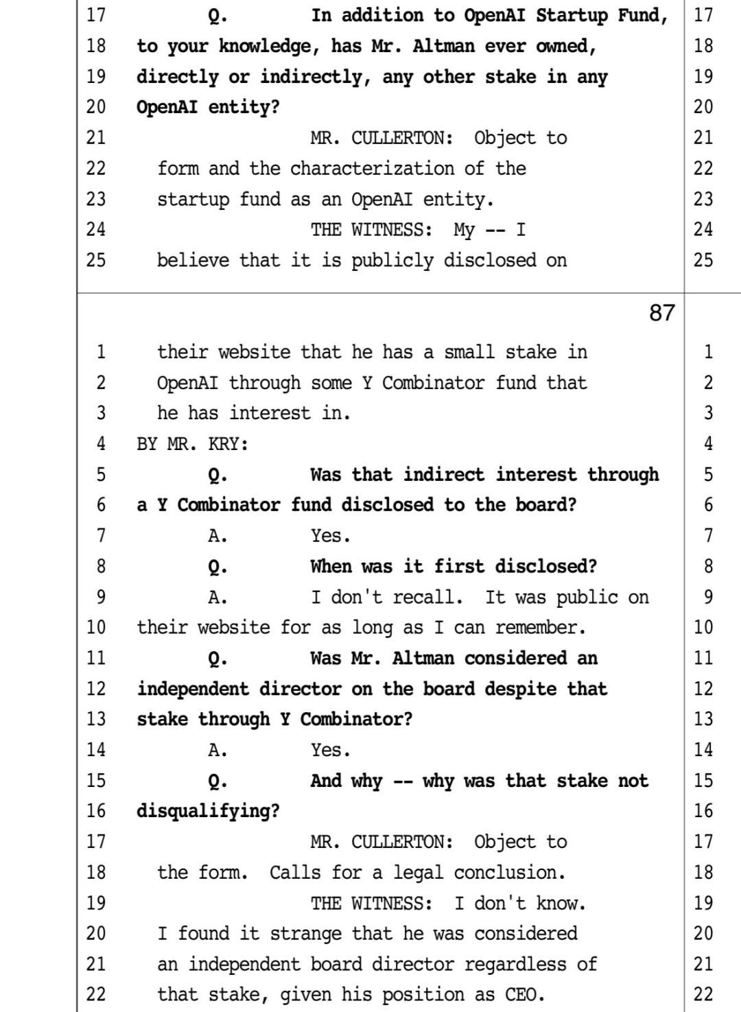 奥特曼隐瞒他通过YC基金间接持有OpenAI的股份,并同时担任非营利组织的独立董事和CEO。