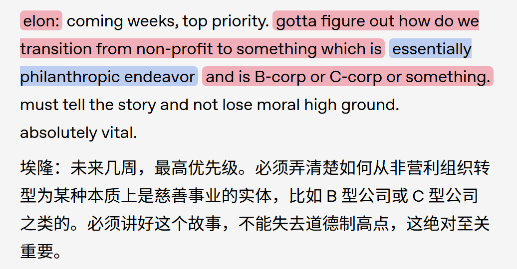 来看这份2017年9月的通话记录,马斯克说:「我们要弄清楚如何从非营利组织过渡到本质上是慈善事业的B-corp(共益企业)或C-corp(普通公司)……必须讲好这个故事,不能失去道德高地。」