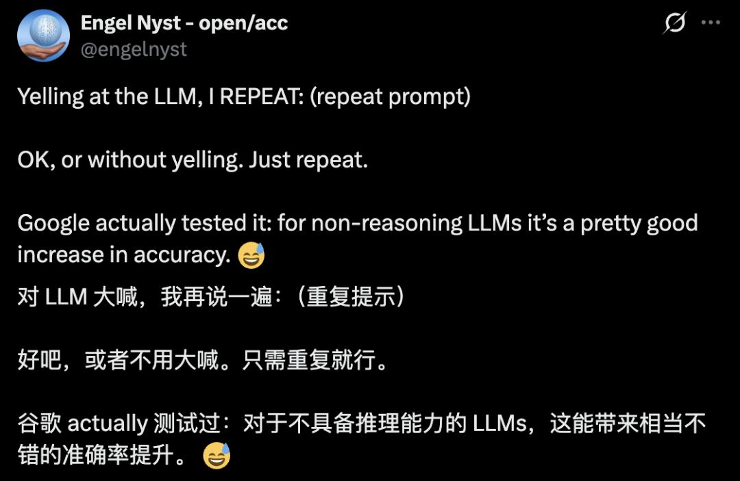 也许不久之后,后台的推理引擎就会悄悄把我们的提示词翻倍后再发给模型。