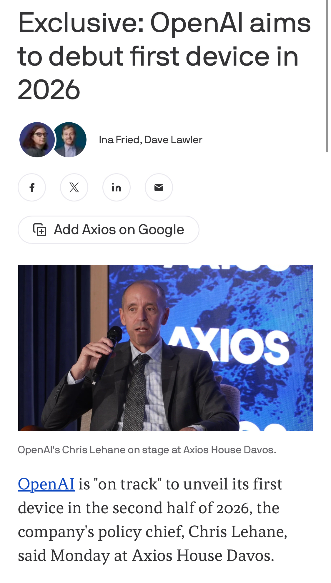 IT之家 1 月 19 日消息,据 Axios 网站报道,OpenAI 政策主管克里斯 · 莱恩周一在达沃斯论坛透露,公司“正按计划”于 2026 年下半年推出其首款设备。
