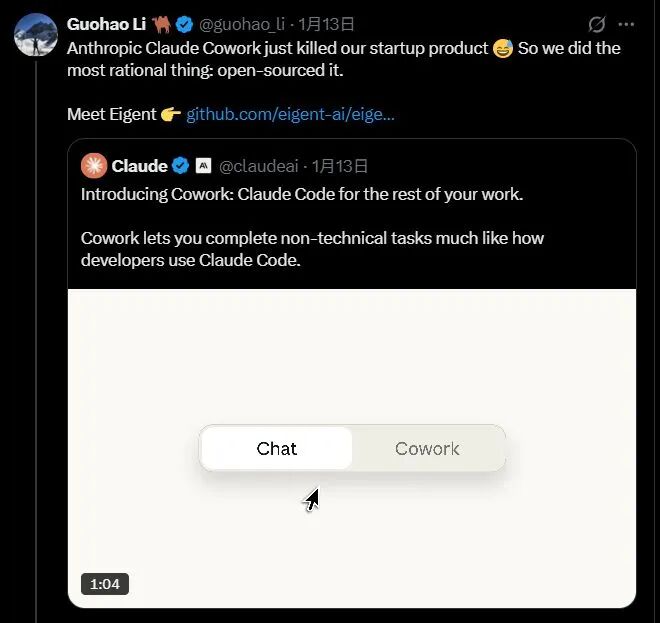 用户Guohao Li甚至表示,由于Claude Cowork的横空出世,他们的类似产品失去了竞争力,于是选择开源。Hugging Face联合创始人托马斯·沃尔夫(Thomas Wolf)也现身评论区表达支持。