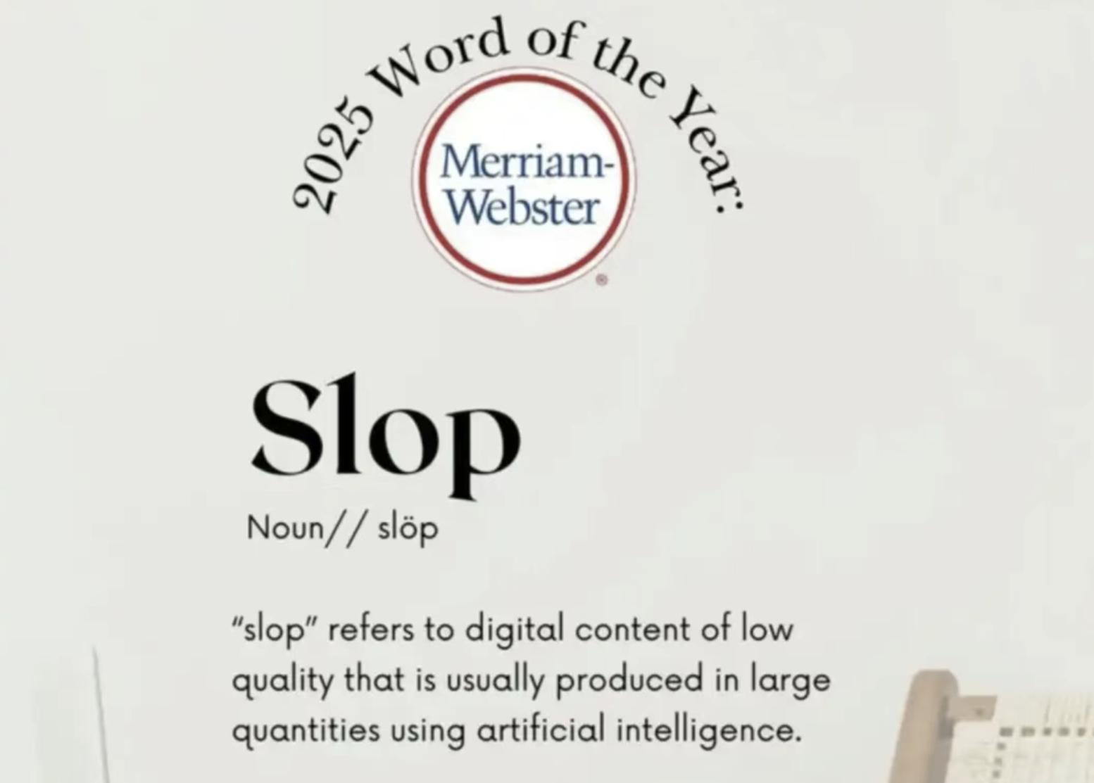 就在前几天,“Slop”被《韦氏词典》列入2025年度热词,被定义为“通常由人工智能(AI)批量生成的低质量数字内容”。据专家溯源,“Slop”在18世纪时意为“软泥”,19世纪时指代“食物残渣”,后引申为“垃圾”“几乎没有价值的产品”,中文则译为“泔水”“脏水”。
