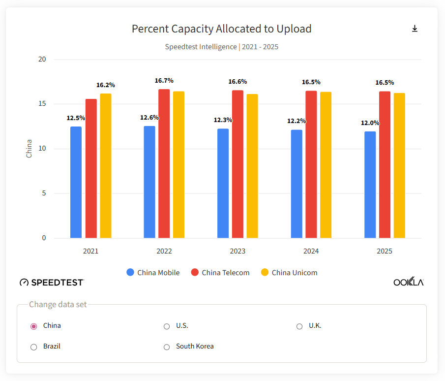 Ookla指出,这表明分配策略更多是由本地市场竞争、用户使用习惯(如中国的直播文化)、以及网络部署战略所驱动的。