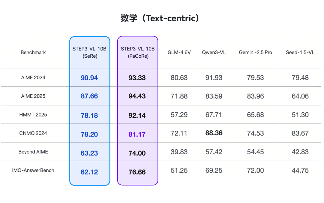 在数学维度上,Step3-VL-10B 表现尤其突出。在 AIME 25/24 等数学竞赛测试题上以几乎满分的成绩达到世界第一梯队水平。
