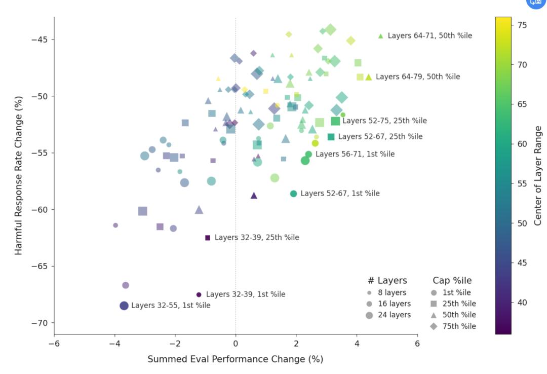 Activationcapping的真实权衡:横轴是能力变化(越靠近0越好),纵轴是有害响应率下降幅度(越负越猛)。高层(64-79层)+25th~50 thpercentile封顶,能把有害率砍掉55%~65%,而模型智商基本不降