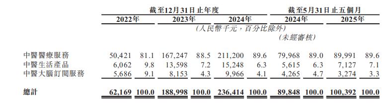 其中,问止中医的主要营收来自中医医疗服务,该业务包括预诊准备、人工智能辅助临床问诊、中医处方、开药及煎药服务。2022年至2024年该板块业务营收占比连续3年超过80%,2025年前五个月这一占比增加到89.6%,接近90%。