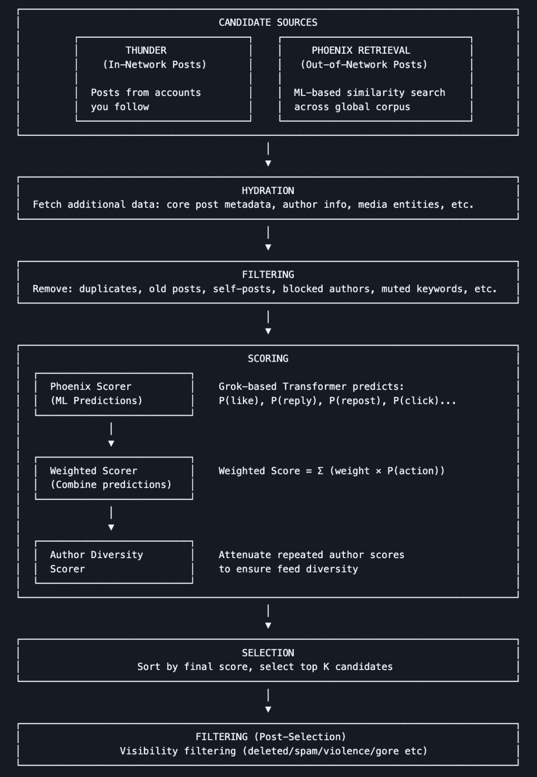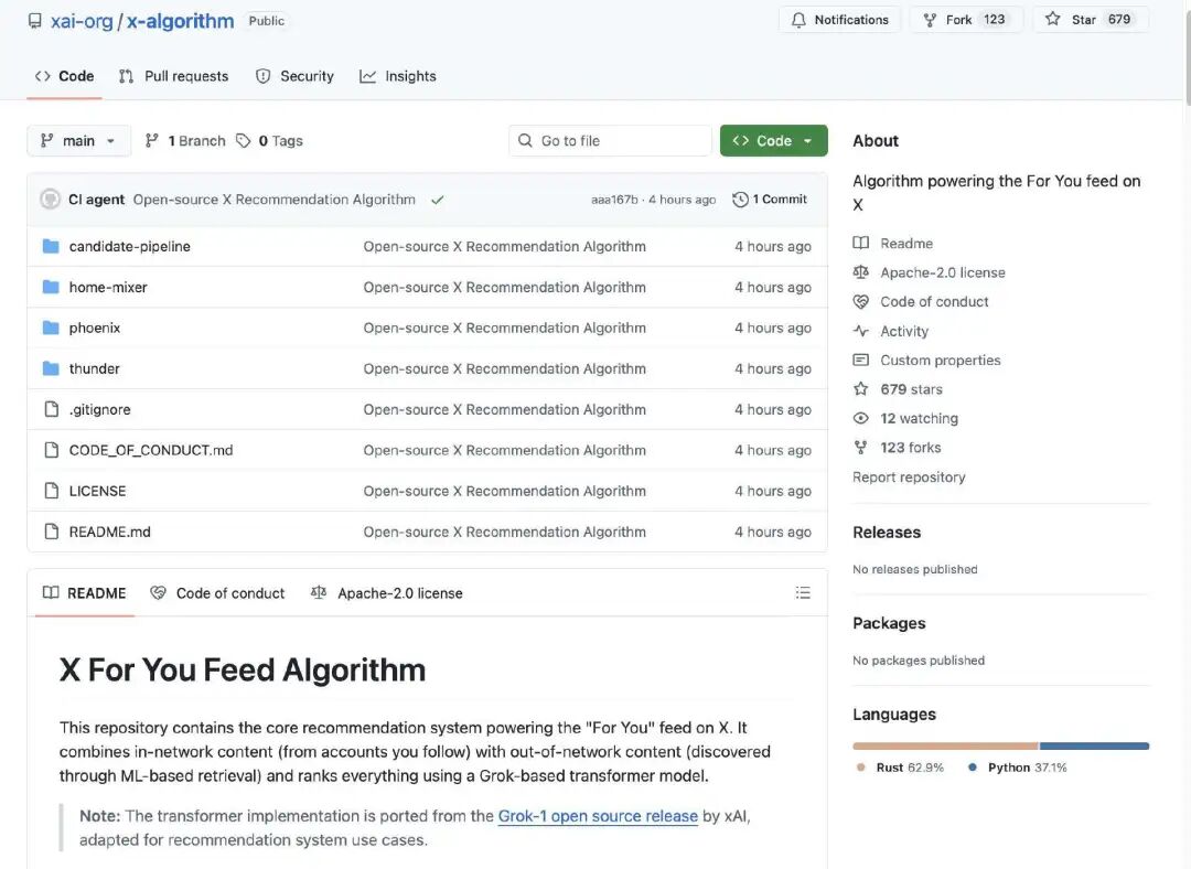 刚刚,X 工程团队在 X 上发帖宣布,正式开源 X 推荐算法,据介绍,这个开源库包含为 X 上的“为你推荐”信息流提供支持的核心推荐系统,它将网络内内容(来自用户关注的帐户)与网络外内容(通过基于机器学习的检索发现)相结合,并使用基于 Grok 的 Transformer 模型对所有内容进行排名,也就是说,该算法采用了与 Grok 相同的 Transformer 架构。