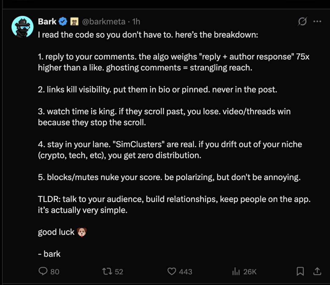 X 推荐算法开源后,在 X 平台,有用户对推荐算法机制做了以下 5 点总结: