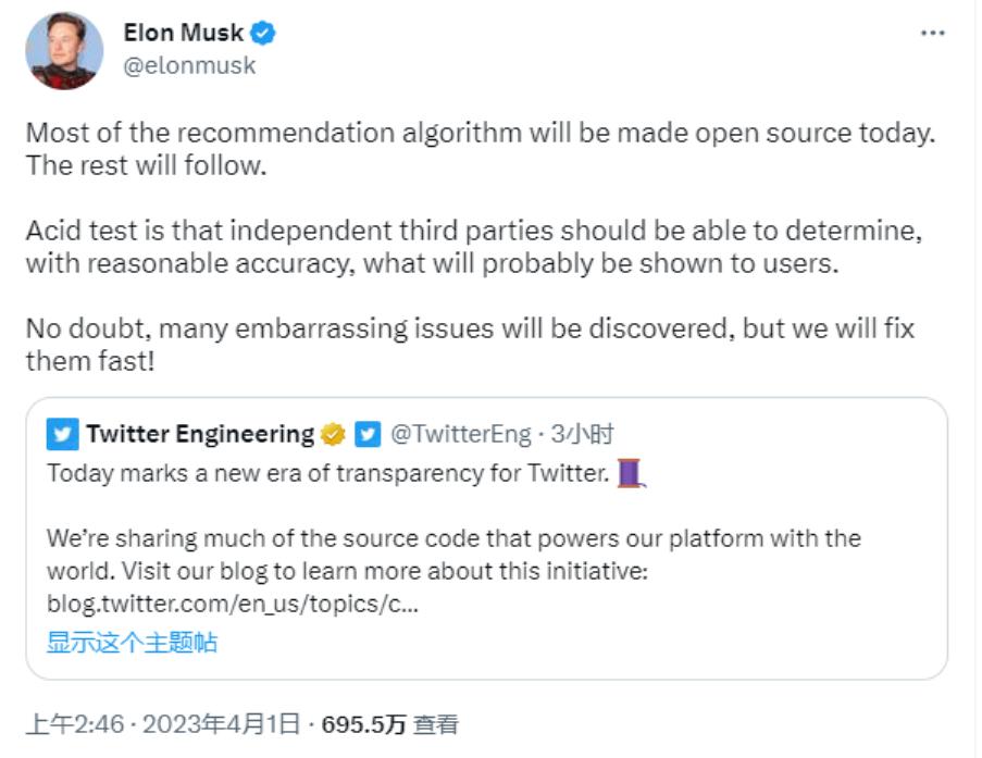 当时,马斯克在 Twitter 上表示此次发布的是“大部分推荐算法”,其余的算法也将陆续开放。他还提到,希望“独立的第三方能够以合理的准确性确定 Twitter 可能向用户展示的内容”。