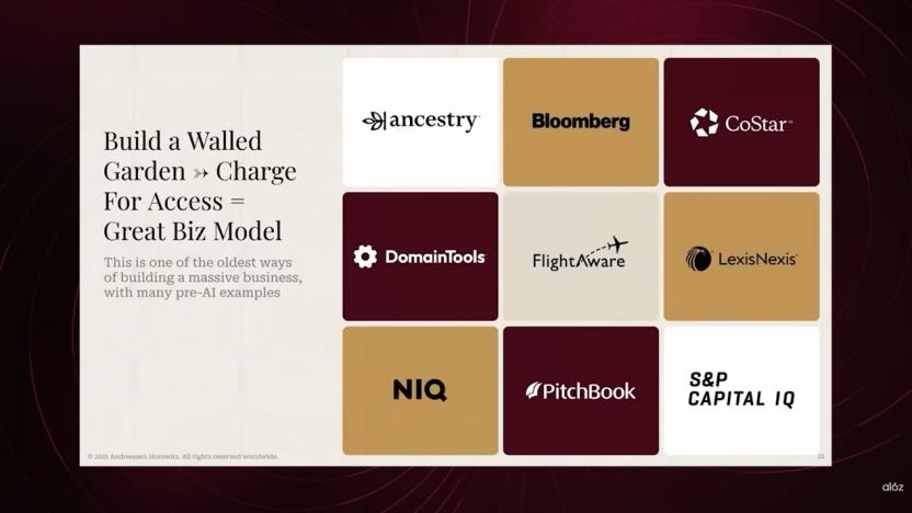 我非常鼓励大家去关注所谓的围墙花园(Walled Garden)及其成果。这里指的不仅仅是创意档案,还包括物流信息,甚至是县政府记录员办公室里的数据。例如,你可以查到谁拥有哪处房产,但这些信息通常必须亲自去线下的办公室才能获取。虽然这些信息本质上是免费的,但如果你能将其数字化、使其易于访问,并在此基础上通过AI增加价值,那么你创造的产品价值将远超数据本身。