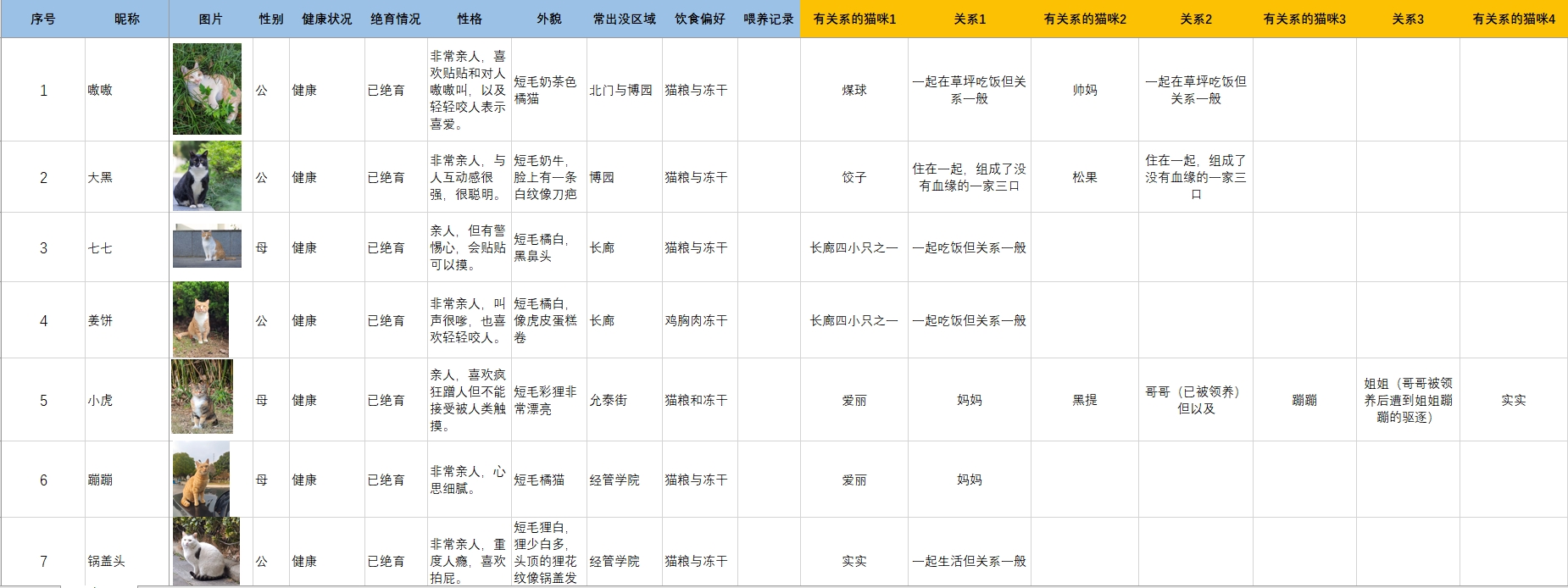 目前,校园里的所有猫咪信息都被记录在一张Excel表格里,虽然做了分类,但还是会出现信息更新不同步、信息杂乱的情况。所有信息都依靠志愿者手动整理,一旦协会人员变动,光是信息对接就得费不少功夫,也容易出现偏差。
