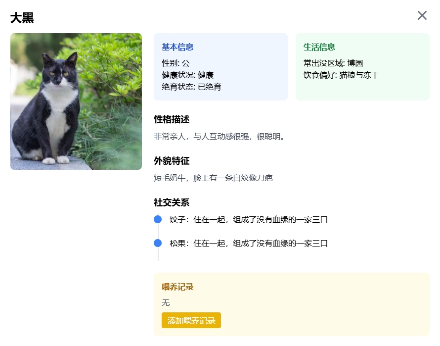 页面干净、直观又充满温度,交互性也完全不输专业人士制作的。既包括猫咪的统计看板——如猫咪的数量、性别分布、常出没区域与绝育比例,还有详细的猫咪图鉴列表,每只猫都有独立的主页,展示着它们的昵称、照片、疫苗记录、饮食偏好,甚至是社交关系。更实用的是,任何人都可以在网页中添加喂养记录,让大家及时看到猫咪的一日三餐与进食时间,“每一个喂食点都记录的话,就不会出现可能两个人同时在喂食点进行投食的这种情况。”游子说。