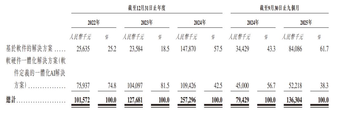 按解决方案类型划分,2022年、2023年、2024年全年及2025年前九个月,极视角基于软件的解决方案收入分别为0.26亿元、0.24亿元、1.48亿元和0.84亿元,软硬件一体化解决方案营收分别为0.76亿元、1.04亿元、1.09亿元、0.52亿元。