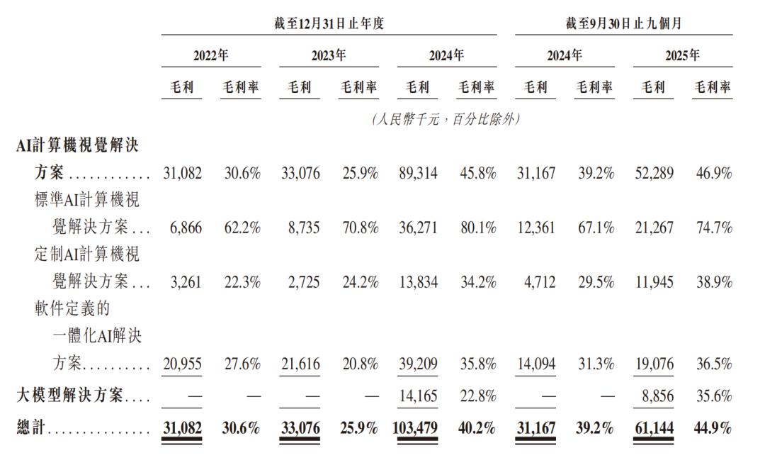 大模型解决方案在2024年及2025年前九个月的营收分别为0.14亿元、0.09亿元,毛利率分别为22.8%、35.6%。