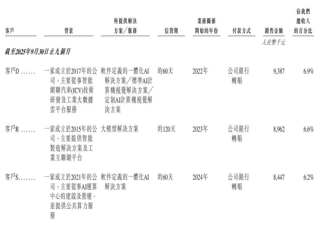 2022年、2023年、2024年全年及2025年前九个月,极视角的前五大客户各自产生的收入分别为0.42亿元、0.80亿元、1.22亿元及0.41亿元,分别占极视角总收入的42.1%、63.0%、48.1%及30.5%。