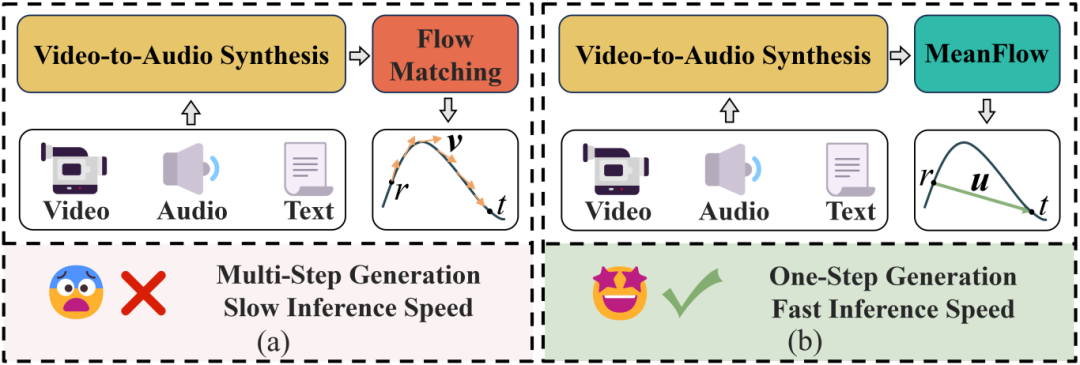 MeanFlow 首次在 V2A 任务中通过平均速度场建模替代传统流匹配(Flow Matching)模型的瞬时速度建模,从根本上解决了多步迭代采样导致的推理速度瓶颈,实现推理阶段的一步生成(one-step generation)。
