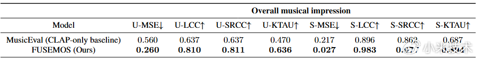 在 MusicEval 基准上的实验结果表明,FUSEMOS 在均方误差(MSE)和排序相关性(如 Spearman 相关系数)等关键指标上均显著优于现有方法,验证了其在音乐感知评估中的有效性。