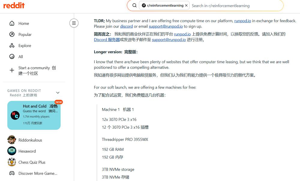 RunPod在Reddit“强化学习”社区发布的试用帖子