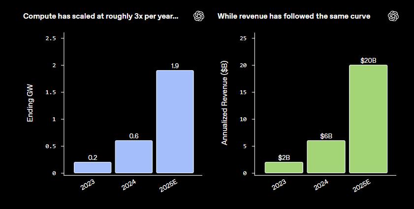 图:OpenAI的算力和收入都以类似趋势增长