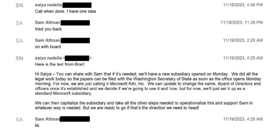 图:纳德拉与奥特曼短信交流记录