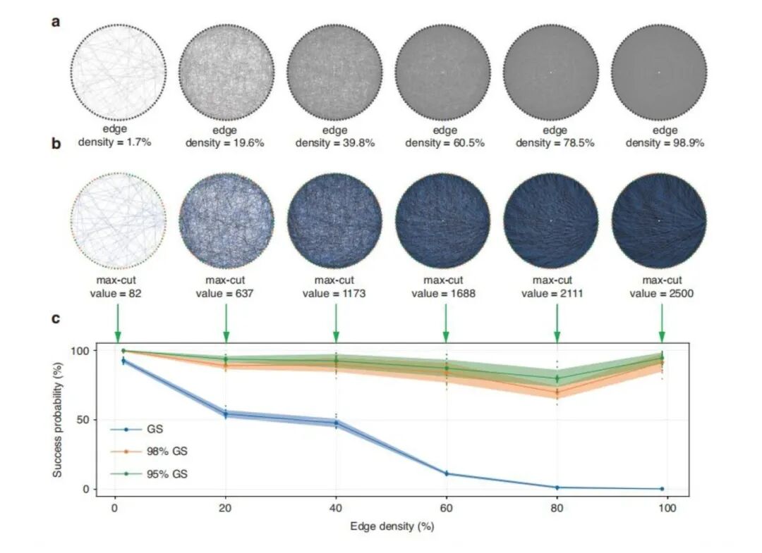 c图:不同边密度随机图的结果。作为边密度函数,求解到的最大割数至少为基态最大割x%的解的概率。所求解的图是具有100个顶点和不同密度的随机图。误差线表示多个100次运行的标准差。
