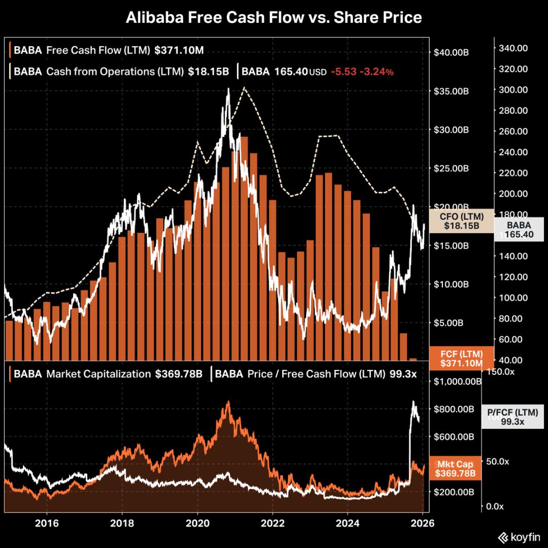 Koyfin的数据显示,截至1月20日,阿里巴巴FCF(LTM)(LTM自由现金流)仅为3.71亿美元,处2016年以来历史最低位,2021年峰值时曾一度高达290亿美元左右。但其“市现比”却处于空前高位,目前仍维持在99.3倍。