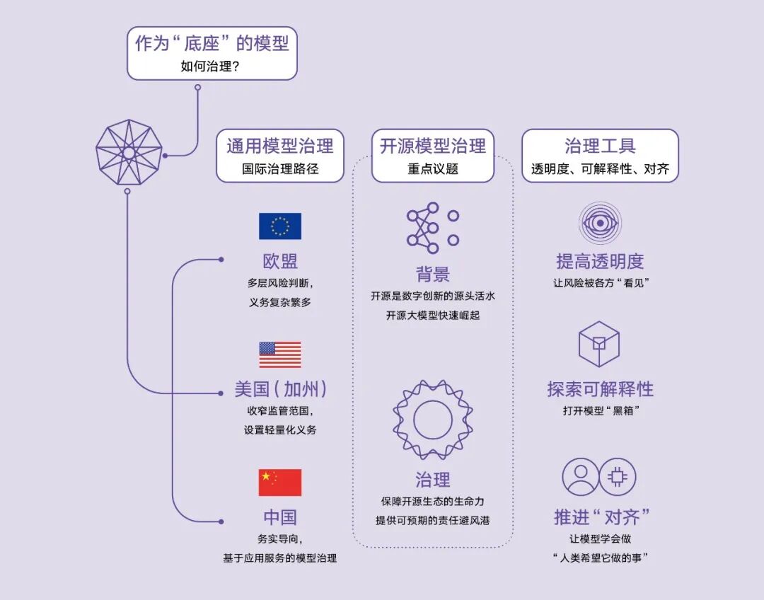 中国采取了“场景切片”策略,通过对算法推荐、深度合成、生成式AI等具体服务的穿透式监管,构建起从数据、到模型到应用的治理体系。模型内生安全方面,在“可解释性”技术尚未突破的当下,透明度已成为全球治理公认的“解药”,无论是欧盟的合规文档还是中国的算法备案,本质上都是通过制度手段缓解信息不对称。