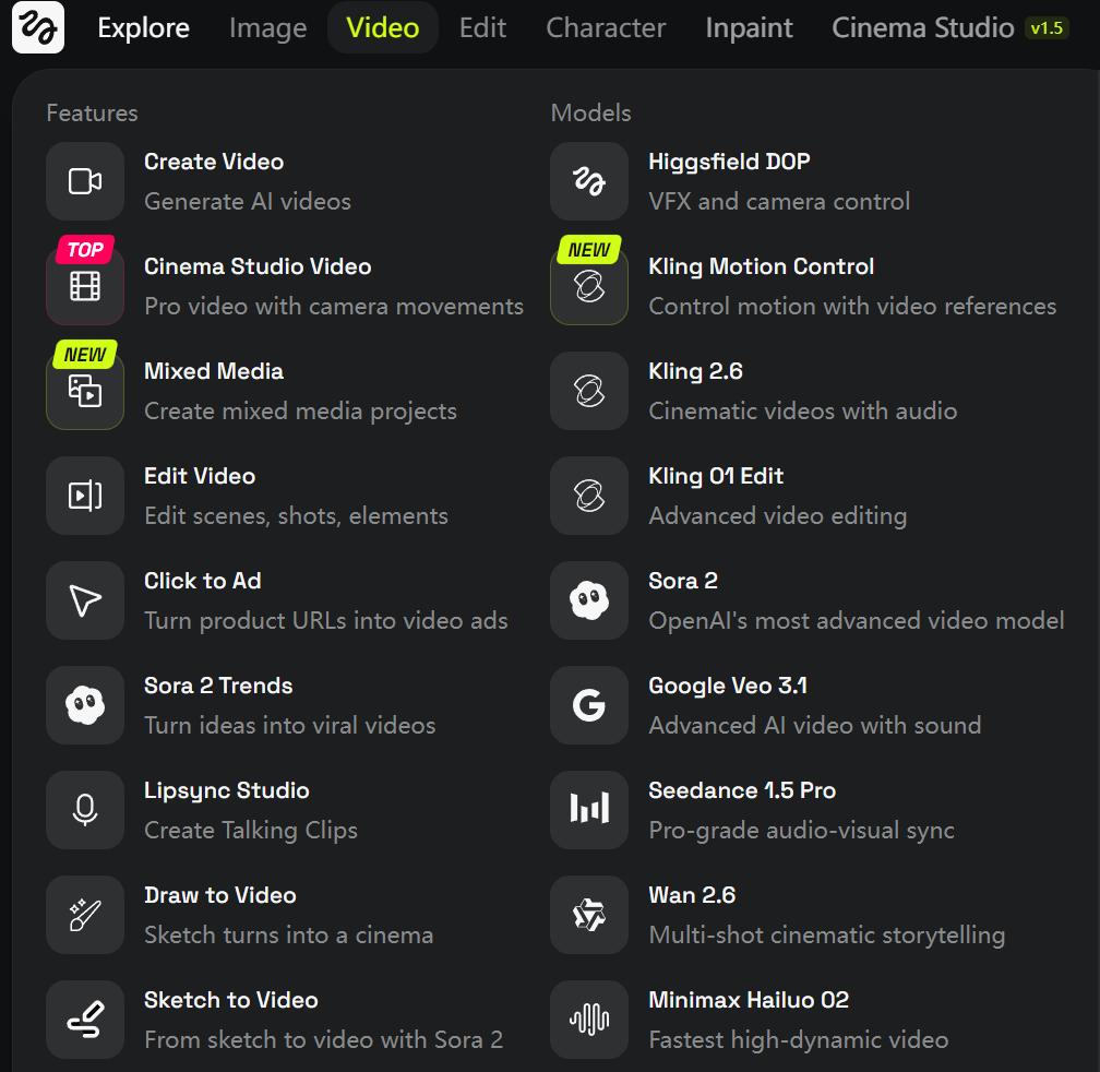 与外界常见的“视频生成模型”不同,Higgsfield的核心叙事已经从“能不能生成视频”,转向了“如何服务真正的AI视频创作者”。