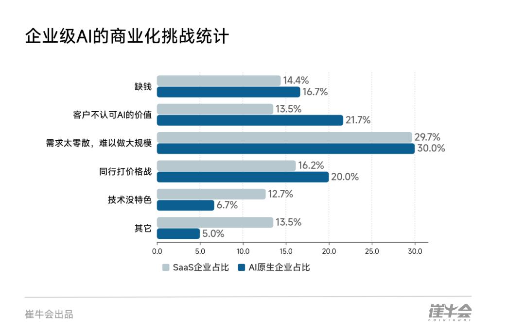 这种碎片化是企业级AI商业化进程中最大的共性瓶颈。无论是SaaS企业还是AI原生企业,均将“需求太零散,难以做大规模”视为最大的挑战,两类企业选择此项的占比分别高达29.7%和30%。