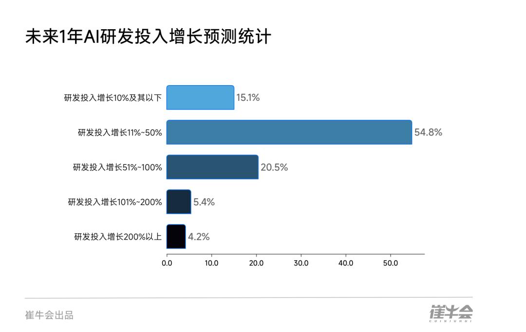 其中,近三分之一的企业计划将研发投入增长率提升至51%以上 。这种高强度投入期,预示着未来一年AI技术本身和产品应用将迎来快速突破。