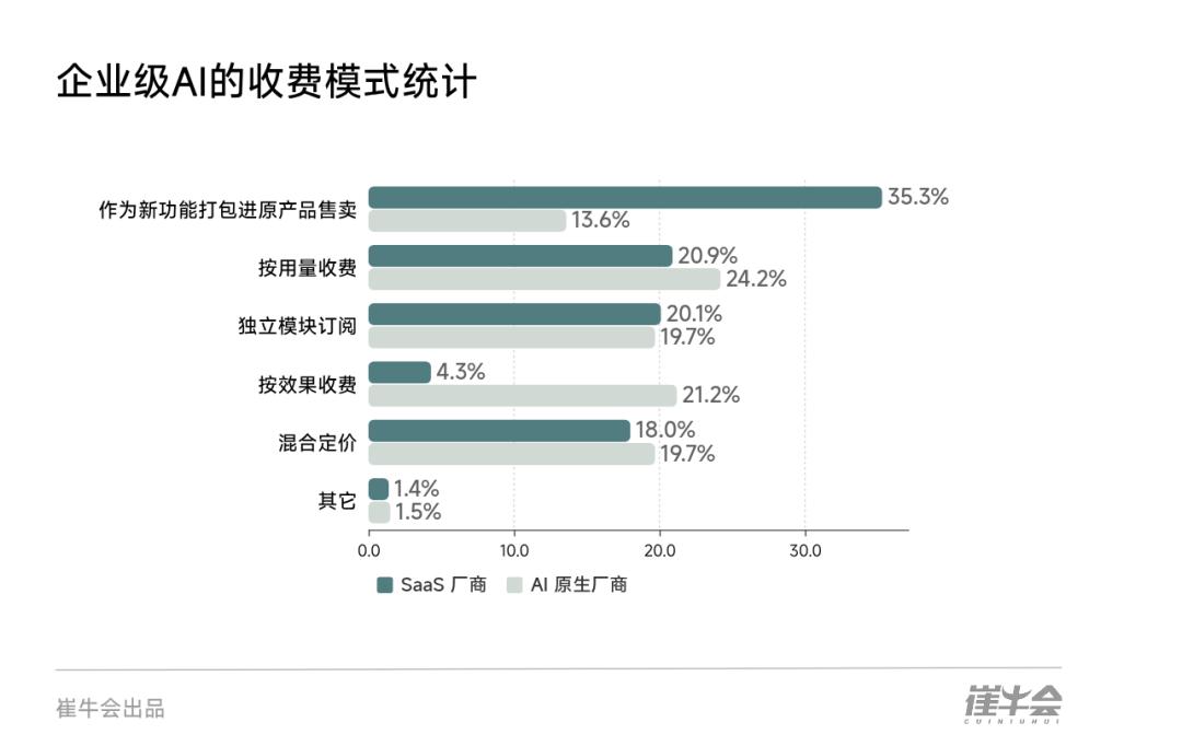 AI原生厂商的商业模式更具弹性,强调技术价值的“立命式”变现。一个值得注意的数据是,高达 21.2% 的AI原生厂商尝试 “按效果收费”。