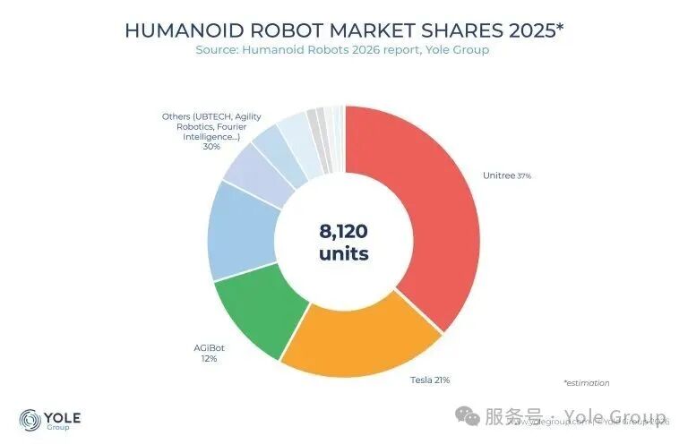 Yole Group指出,该市场高度活跃,《仿人机器人2026》报告中共统计了60多家人形机器人制造商,其中超过一半来自中国。因此,在前五大厂商中,有三家为中国企业也就不足为奇。目前,中国的宇树以37%的市场份额位居第一。