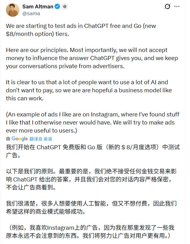 除此之外,所有付费用户(包括20美元/月的Plus用户、200美元/月的Pro用户、商业和企业客户)、所有18岁以下用户,以及目前美国以外的所有地区用户,都无法看到广告。