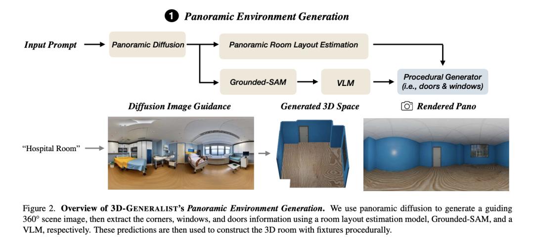 图2:3D-GENERALIST全景环境生成概述。全景扩散模型生成引导性360°场景图像,然后房间布局估计模型、Grounded-SAM和视觉语言模型提取角落、窗户和门的信息。这些预测随后被用于通过程序化方式构建带有构件的3D房间