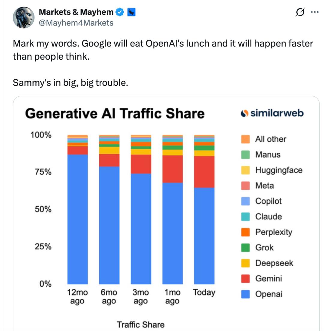 今天,有 X 博主发帖称,「谷歌迟早会抢光 OpenAI 的饭碗,而且速度会比人们想象的还要快。奥特曼这下麻烦大了。」