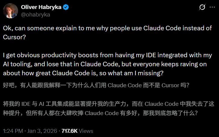 Twitter上曾有疑论者问:「有人能解释一下为什么用Claude Code而不是Cursor吗?」