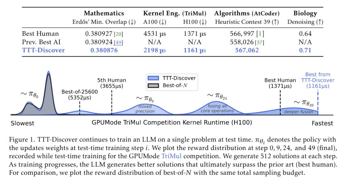 他把 TTT 用在了最硬核的科学发现上。不再是为了适应坏数据,而是为了在推理时「进化」出超越预训练水平的智力,去解决人类都解不开的难题。