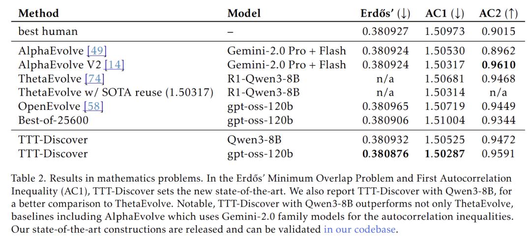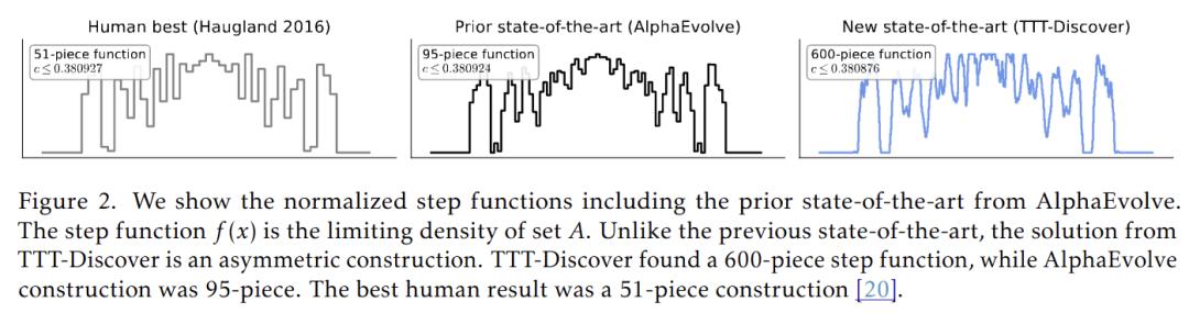 在著名的Erdős 最小重叠问题(一个困扰数学家数十年的数论难题)上,人类和此前最强 AI(AlphaEvolve)的竞争已经卷到了小数点后几位。TTT-Discover 进场后,直接把上界从 0.380924 压低到了0.380876。