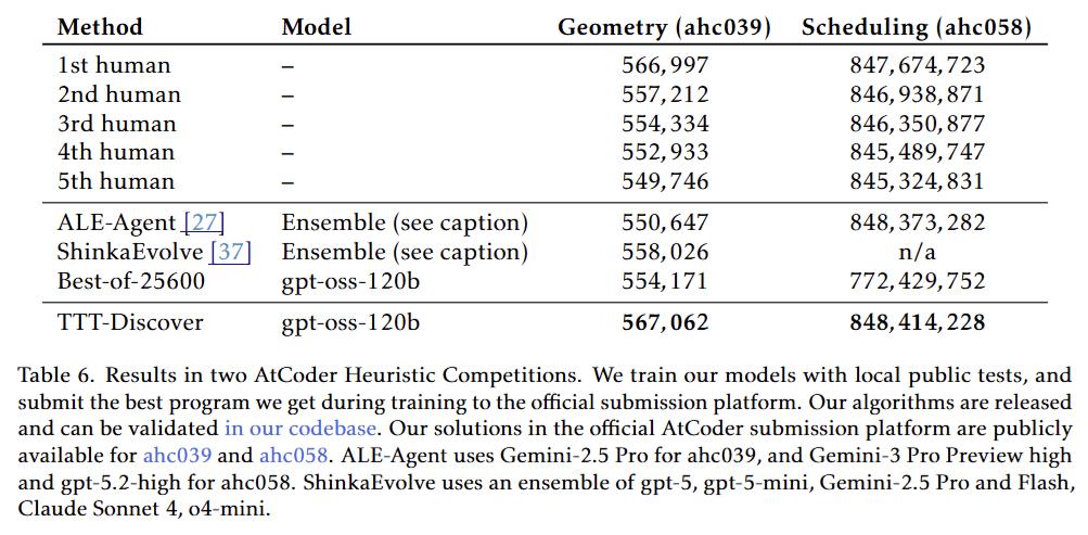 在著名的 AtCoder 启发式竞赛(ahc039, ahc058)中,它不仅击败了之前最强的 AI 智能体,还超越了人类金牌选手的历史最佳成绩。