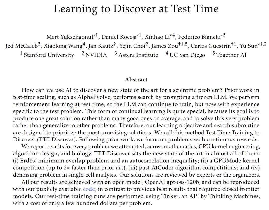 但就在本周,一篇名为《Learning to Discover at Test Time》的论文横空出世,来自斯坦福大学和英伟达的研究团队提出了一种不仅「打草稿」,而且敢在考场上「现场长脑子」的新范式——TTT-Discover(Test-Time Training,测试时训练)。