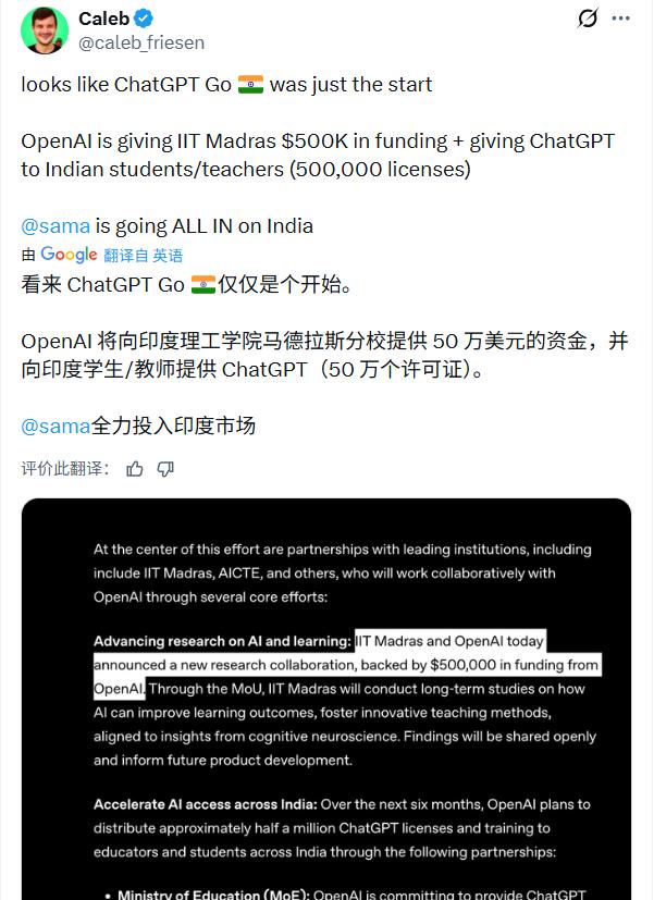 OpenAI看准了这个机遇,在印度推出“ChatGPT Go”订阅服务的12个月免费试用,月费仅约5美元。该公司认为教育是“最有前景的领域”。